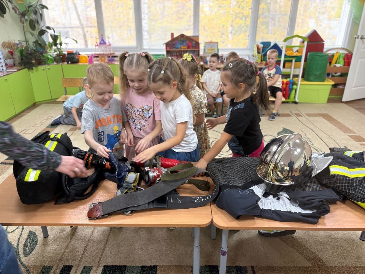 Владимир Юрьевич принес с собой много интересных вещей и рассказал о работе пожарного!Дети получили приглашение посетить пожарную часть!!
