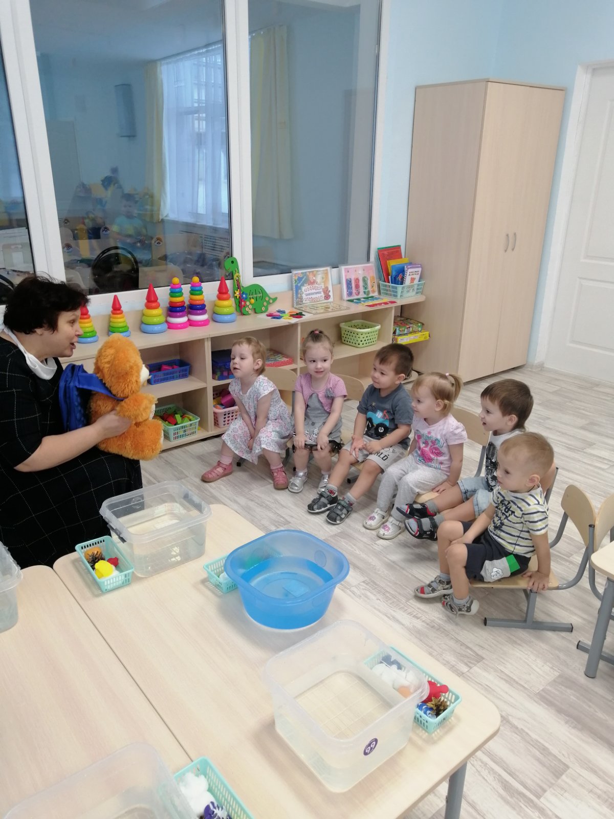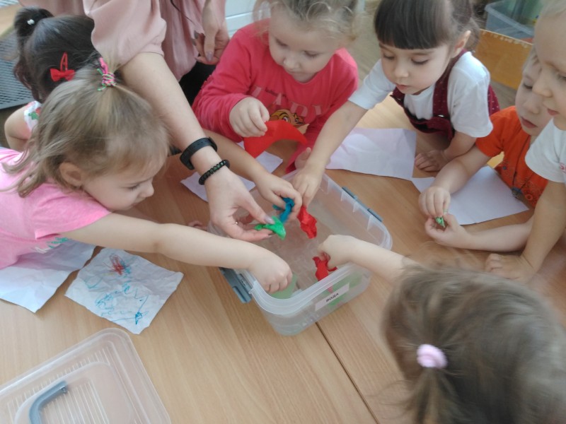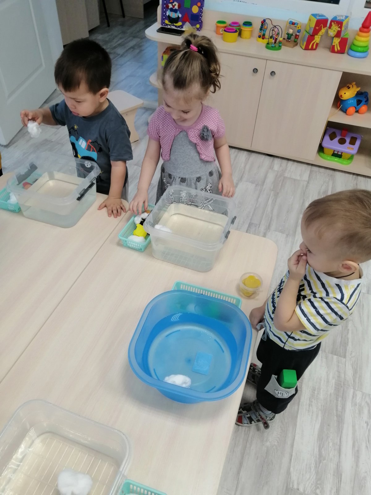 Воспитанники группы раннего возраста очень любопытные, любят наблюдать, экспериментировать. В группе прошло занятие по познавательному развитию с элементами экспериментирования на тему «Твёрдое-мягкое». В гости к малышам пришёл Медвежонок и принёс детям рюкзак с разными предметами. Дети, играя с ним, получили знания о качестве предметов, научились различать и называть предметы (мягкая вата, твёрдый камень). Детям было предложено провести опыт с камнем и ватой, можно их помять или нет, тонут они или нет. Дети с удовольствием экспериментировали с разными предметами.