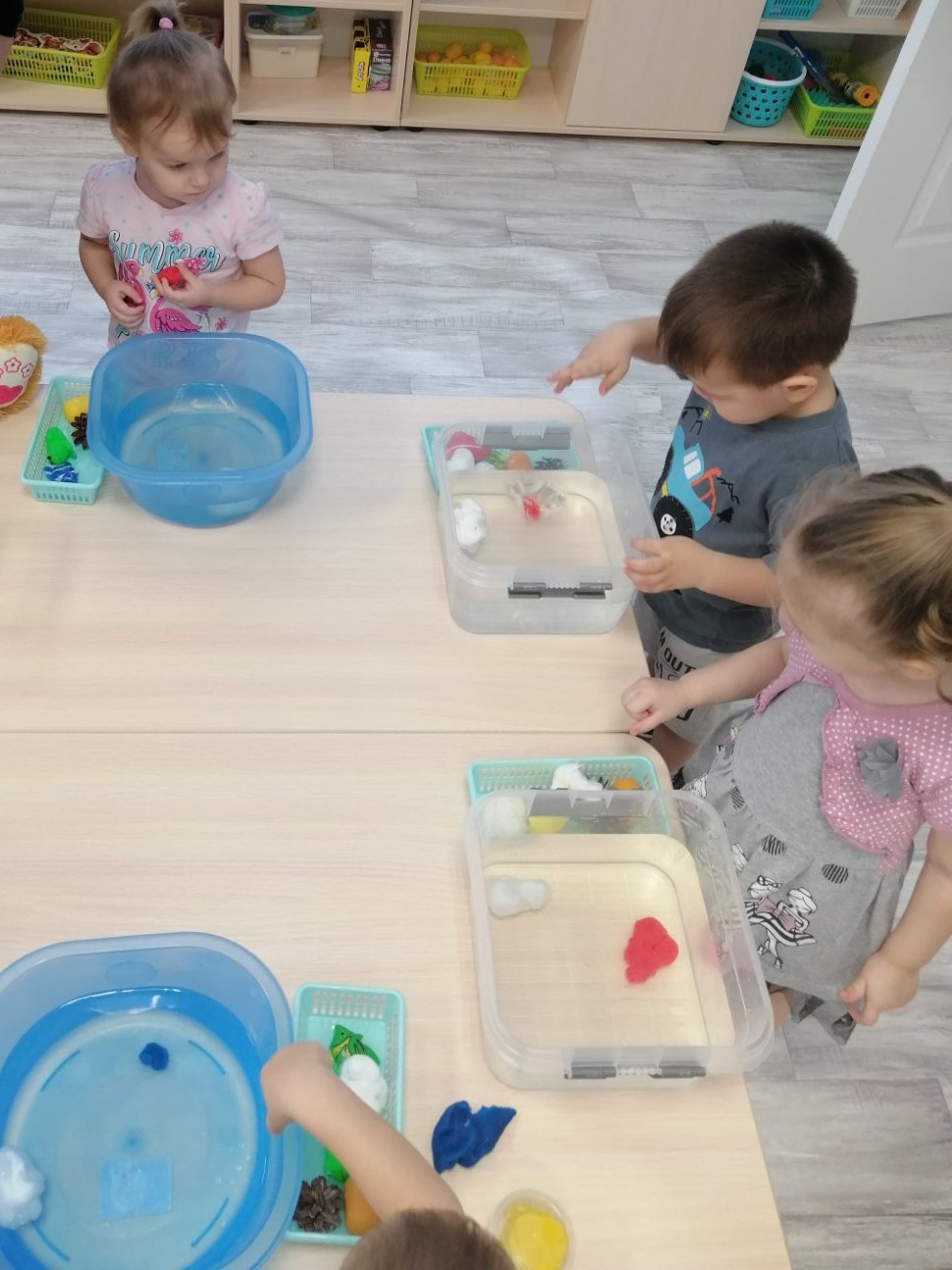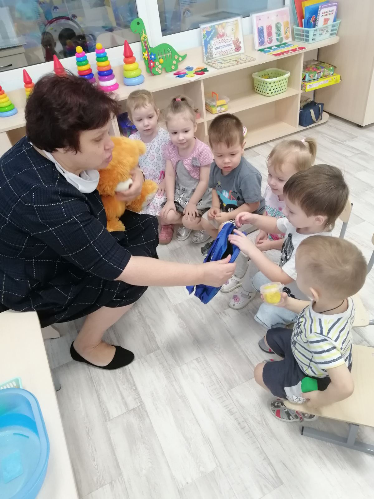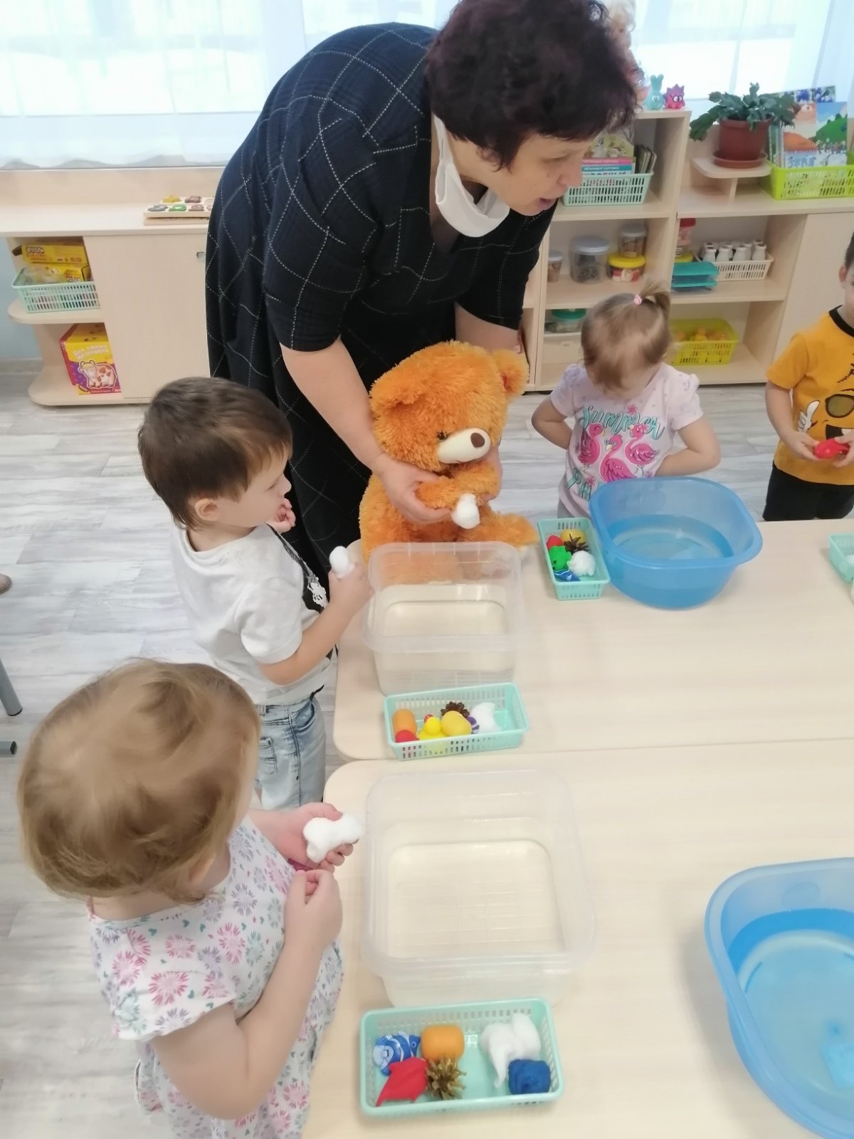 Воспитанники группы раннего возраста очень любопытные, любят наблюдать, экспериментировать. В группе прошло занятие по познавательному развитию с элементами экспериментирования на тему «Твёрдое-мягкое». В гости к малышам пришёл Медвежонок и принёс детям рюкзак с разными предметами. Дети, играя с ним, получили знания о качестве предметов, научились различать и называть предметы (мягкая вата, твёрдый камень). Детям было предложено провести опыт с камнем и ватой, можно их помять или нет, тонут они или нет. Дети с удовольствием экспериментировали с разными предметами.