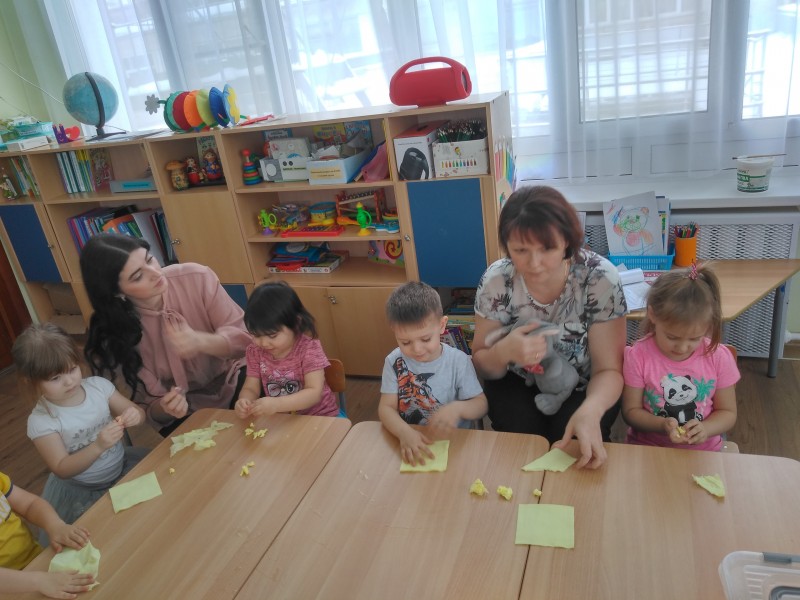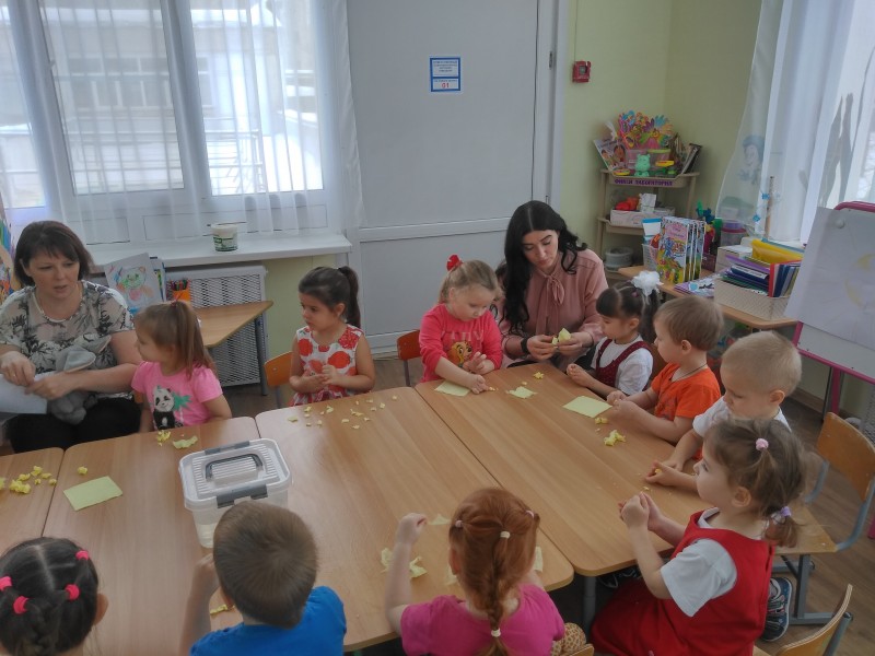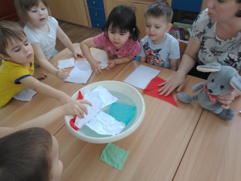 Во 2 младшей группе №1 к детям в гости пришёл Мышонок, в игровой форме дети вместе с гостем знакомятся со свойствами бумаги, бумажных салфеток. Визит в группу сказочного персонажа отлично мотивирует детей к работе, дети с радостью включились в творческую коллективную деятельность.