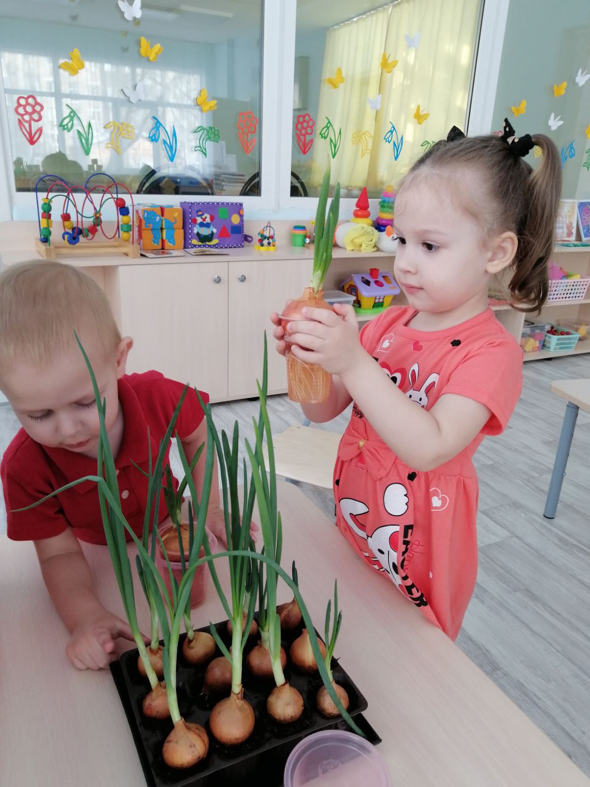 Воспитанники I младшей группы под руководством воспитателей Ефанкиной С. В. и Дорофеевой С. Ю. посадили лук.Воспитатели рассказали и показали всю последовательность посадки лука. Педагоги напомнили, что лук надо обязательно есть, так как в нём содержится много витаминов и минералов, которые полезны для организма. Вместе с детьми рассмотрели лук, уточнили, что лук круглый, твёрдый, в светло-коричневых чешуйках (они шуршат), показывали верх и низ (донце) луковицы. После ознакомления воспитанники посадили луковицы в ящик с землёй, теперь они будут наблюдать за ростом зелёного лука, поливать его и срезать выросшие зелёные перья. Теперь на их «грядке» вырастет вкусный, витаминный, зелёный друг!