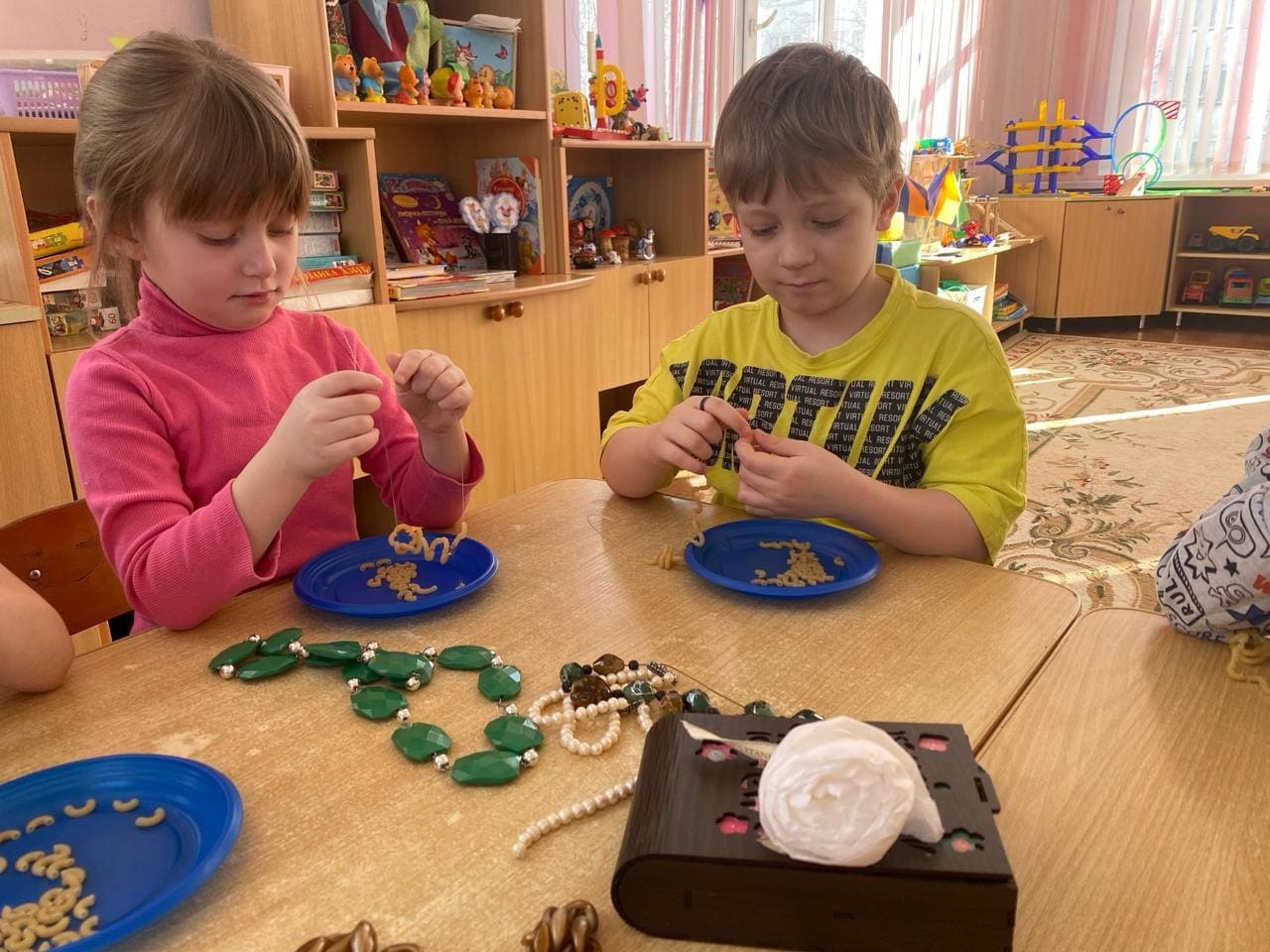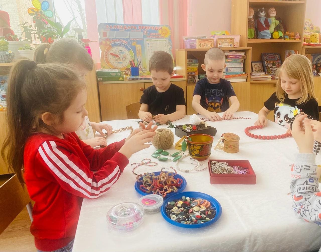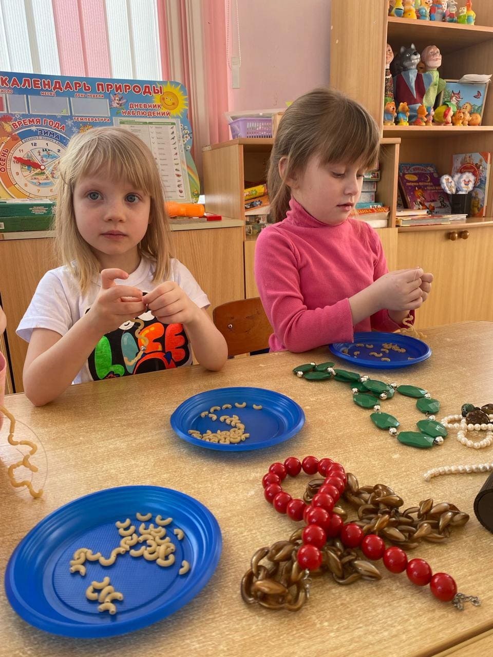 Ребята из старшей группы изготовили бусы своими руками из разных материалов: из макарон, скрепок, пуговиц.