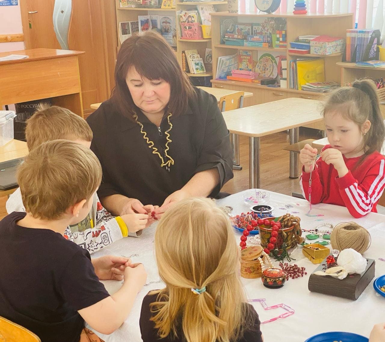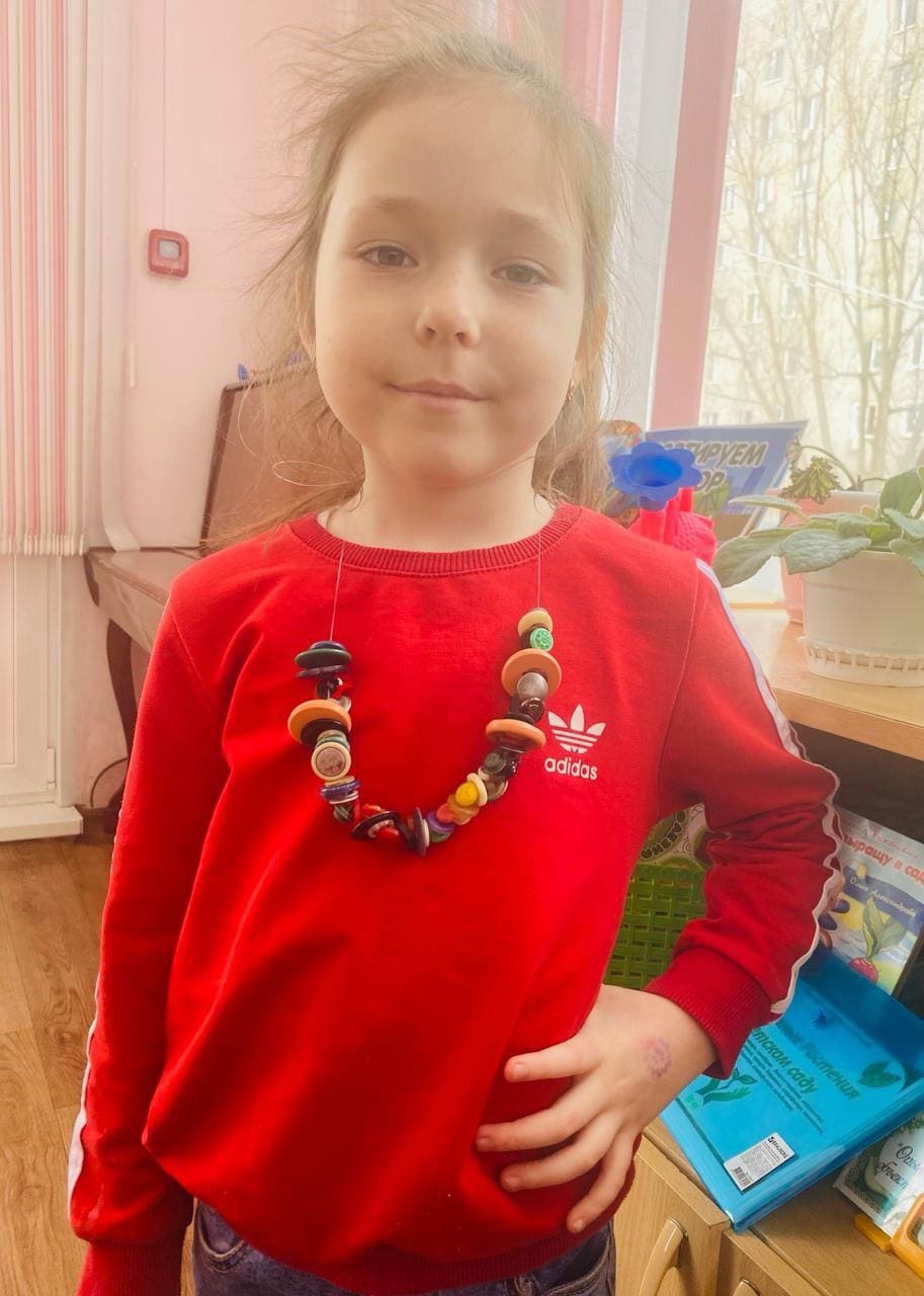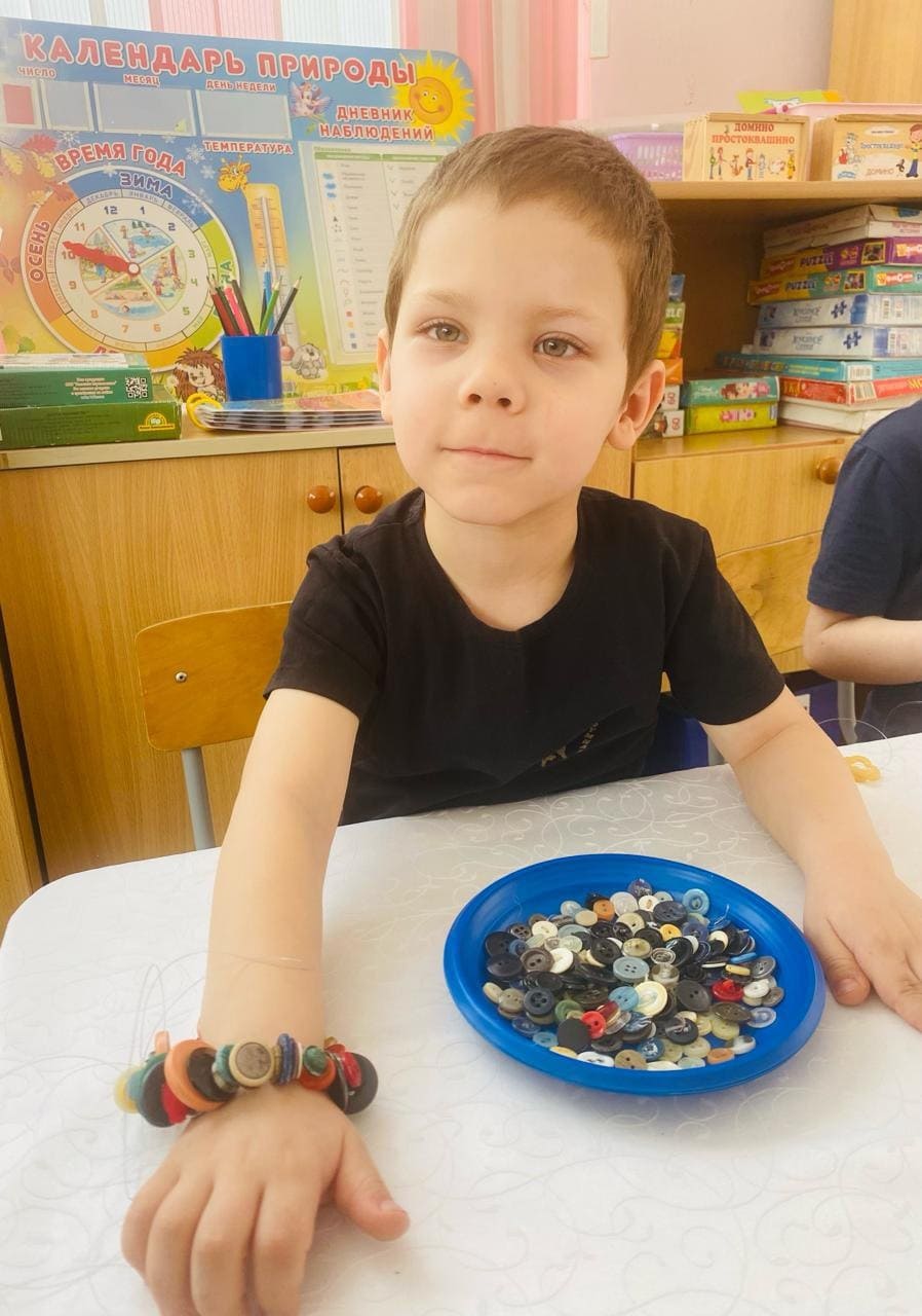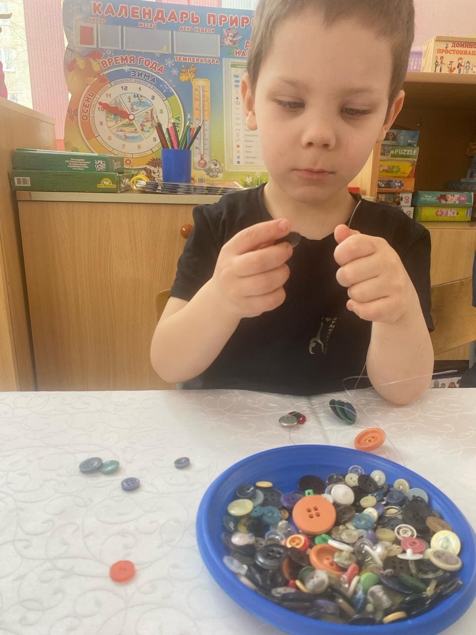 Ребята из старшей группы изготовили бусы своими руками из разных материалов: из макарон, скрепок, пуговиц.