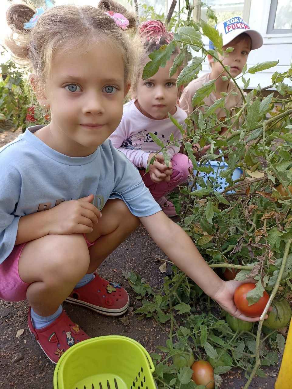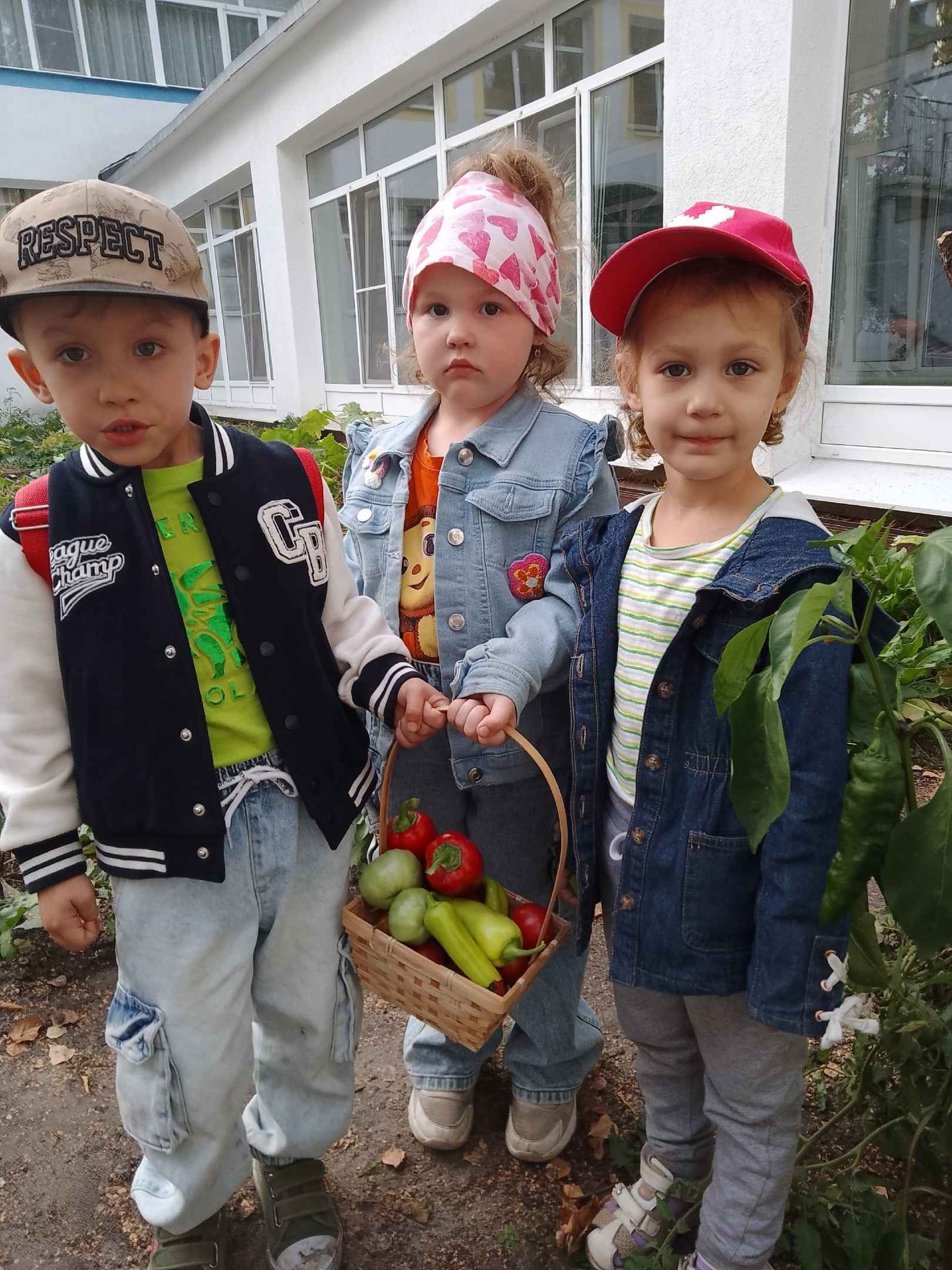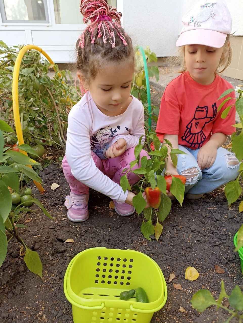 Дети детского сада, совместно с воспитателями и родителями посадили весной свои маленькие огороды, ухаживали за ними, поливали, рыхлили почву и наблюдали за тем, как из маленьких росточков росли и развивались огурцы, томаты, кабачки, перцы и другие овощи. Посмотрите, на наш богатый урожай!