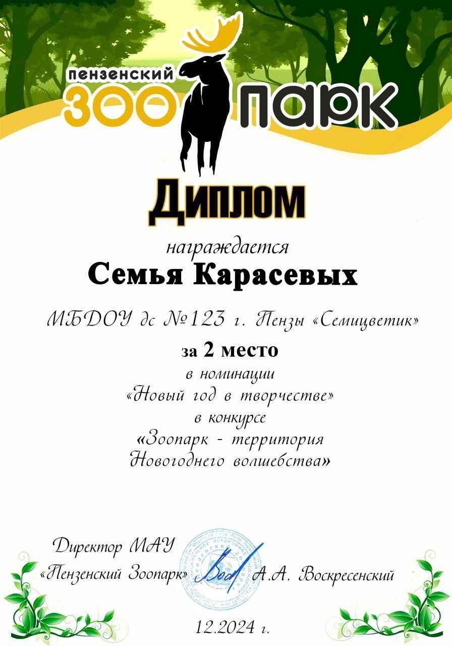 Семьи воспитанников 2 младшей группы принимали участие в творческом конкурсе Пензенского зоопарка «Зоопарк — территория Новогоднего волшебства». На конкурсы они предоставили работы в разных техниках и из разных материалов на новогоднюю тематику.
