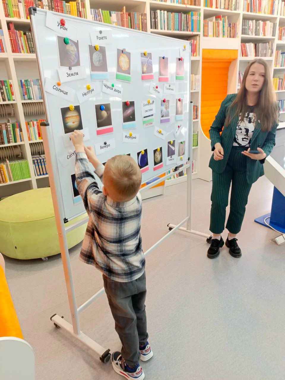 Дети познакомились с историей праздника и подобрали к каждой букве из слова «КОСМОНАВТ» какою-либо черту характера, необходимую для настоящего космонавта. Мальчики и девочки поучаствовали в игре на сопоставление «Планетарное имя» — ребятам необходимо было подобрать названия планет к их изображениям. Кроме того, юные космонавты разгадали интерактивный «Космический кроссворд», содержащий вопросы о небесных телах и космических явлениях. Самым интересным заданием для ребят был «Орбитальный дом»: дошколята распределяли планеты по орбитам в порядке убывания от Солнца.