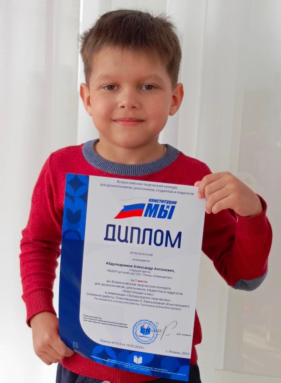 Воспитанник старшей логопедической группы Абдулкаримов Александр награждён дипломом за 1 место во Всероссийском творческом конкурсе «Конституция и мы».