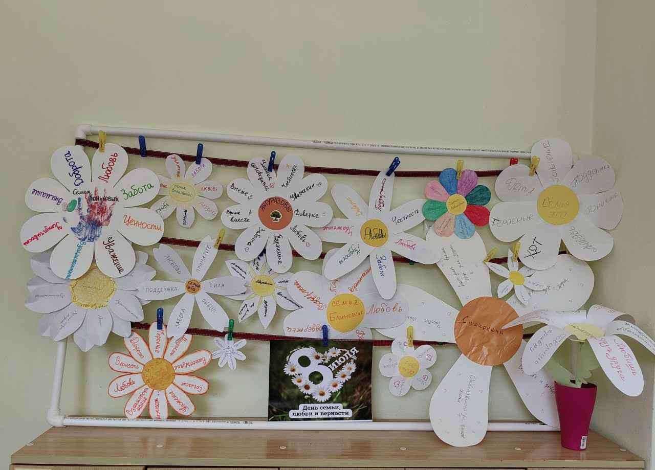 Дети совместно с родителями изготовили дома ромашки и на лепестках написали секреты семейного счастья своих семей.