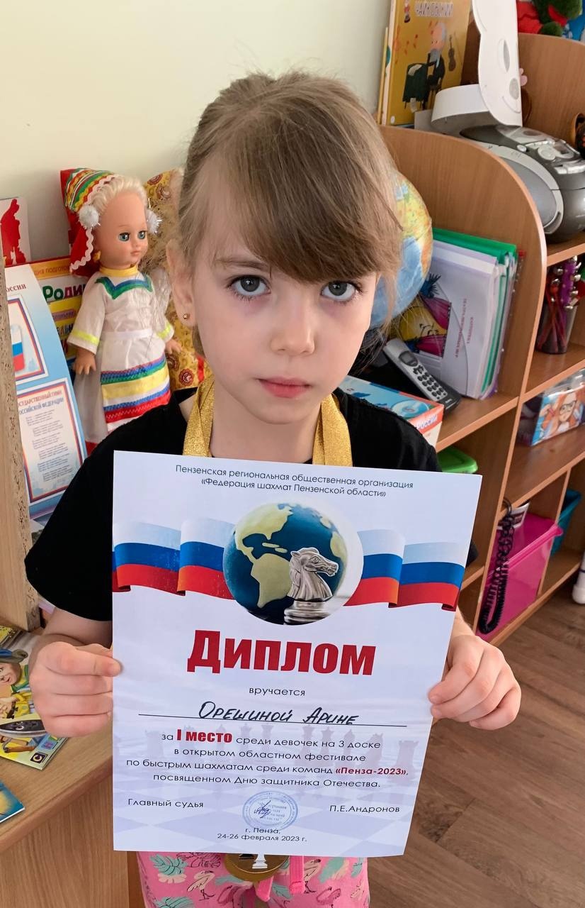 Арина Орешина, посещающая подготовительную логопедическую группу 2 занимается шахматами.. На турнирах она-сильный игрок и опасный соперник. А дома и в детском саду-обычный дошкольник, которому не сидится на месте.