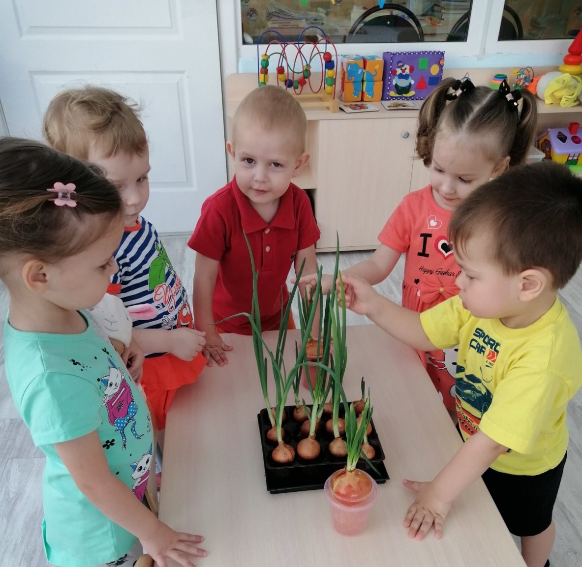 В марте в I младшей группе был реализован проект «Посадка лука» с целью вызвать у детей познавательный интерес к посадке репчатого лука для выращивания на перо в комнатных условиях, о пользе лука.