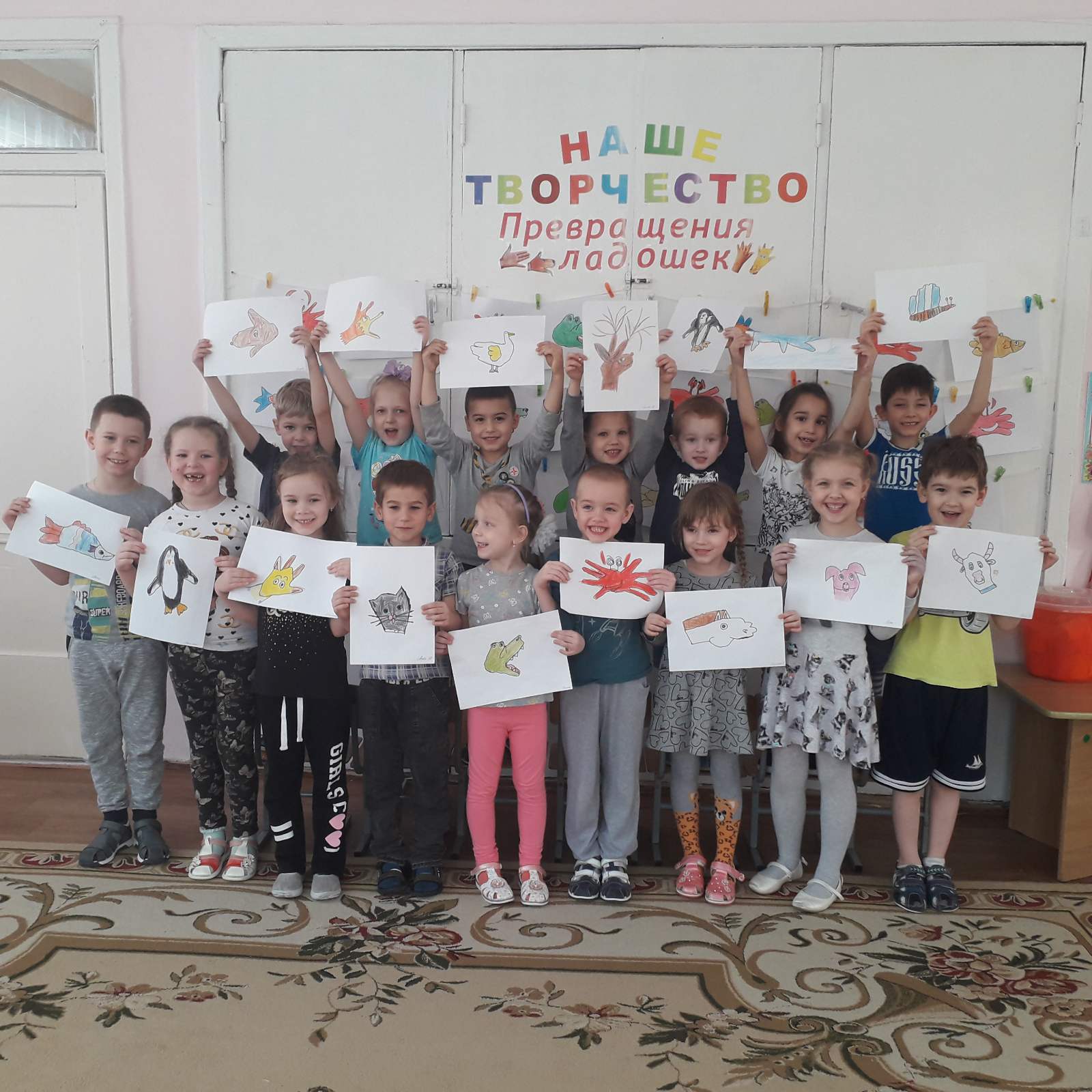 В садике рисуем краской, ушки, носики и глазки,