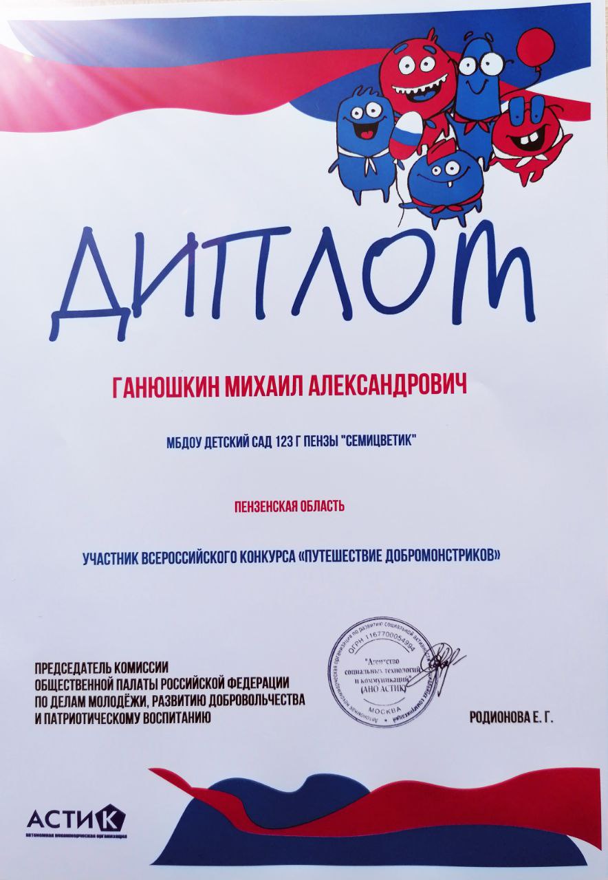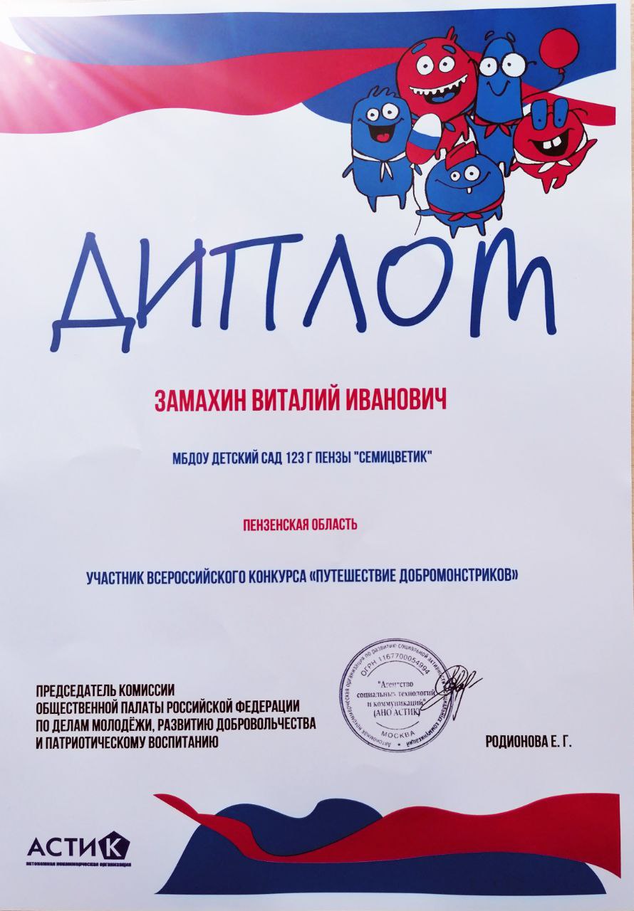 Воспитанники волонтёрского центра МБДОУ детский сад 123 г Пензы «Семицветик» приняли участие во всероссийском конкурсе Агентства социальных технологий и коммуникаций и центра поддержки родителей «Вместе ради будущего» — «Путешествие добромонстриков». Целью которого была популяризация исторических мест родного города.