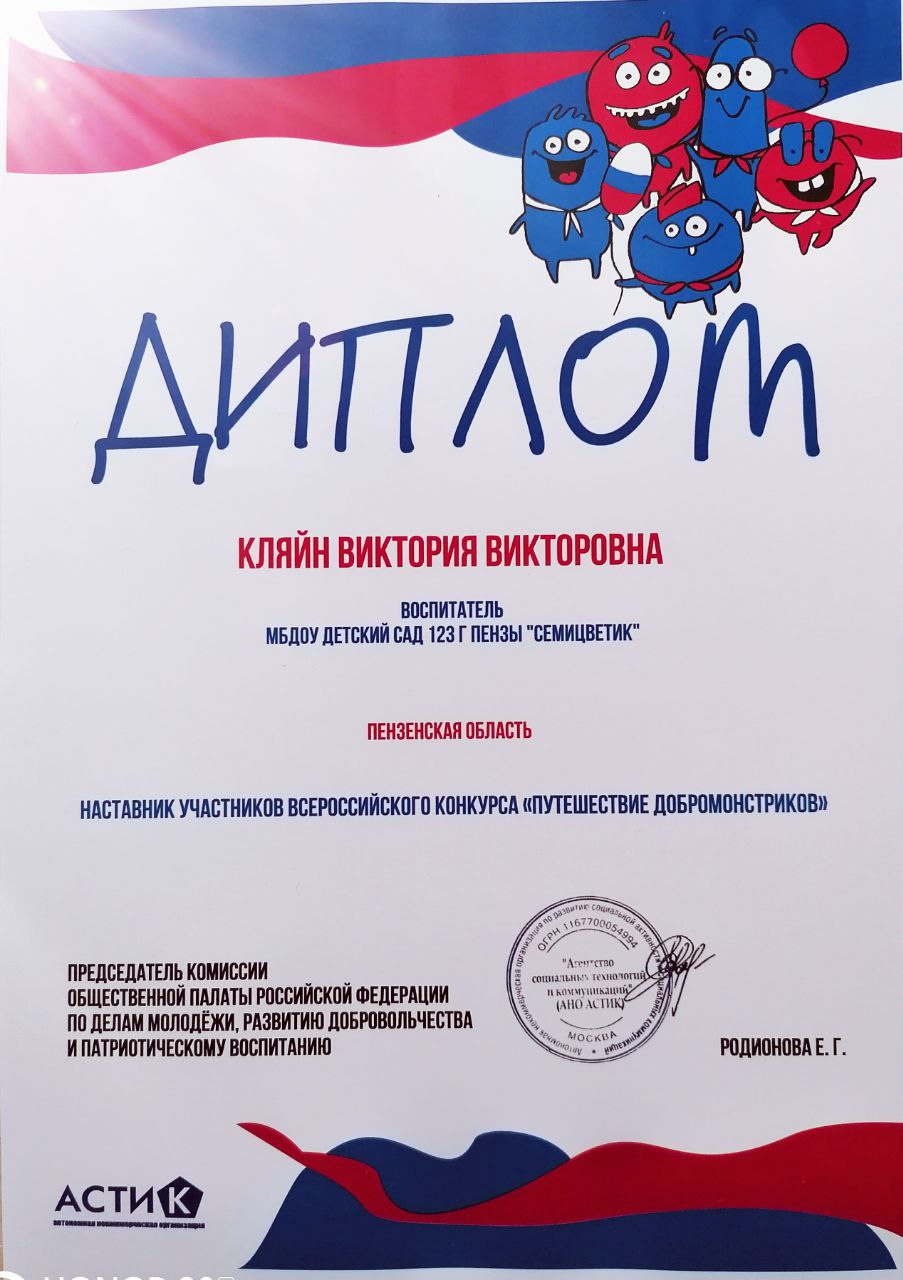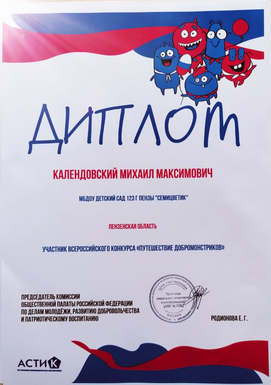 Дипломами Общественной палаты Российской Федерации по делам молодёжи, развитию доброволтничества и патриотическому воспитанию были награждены Богаченко Евгения, Замахин Виталий, Календовский Михаил, Календовский Михаил и наставник участников — воспитатель, Кляйн Виктория Викторовна.
