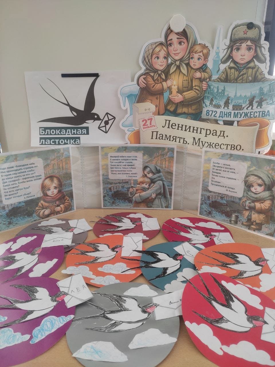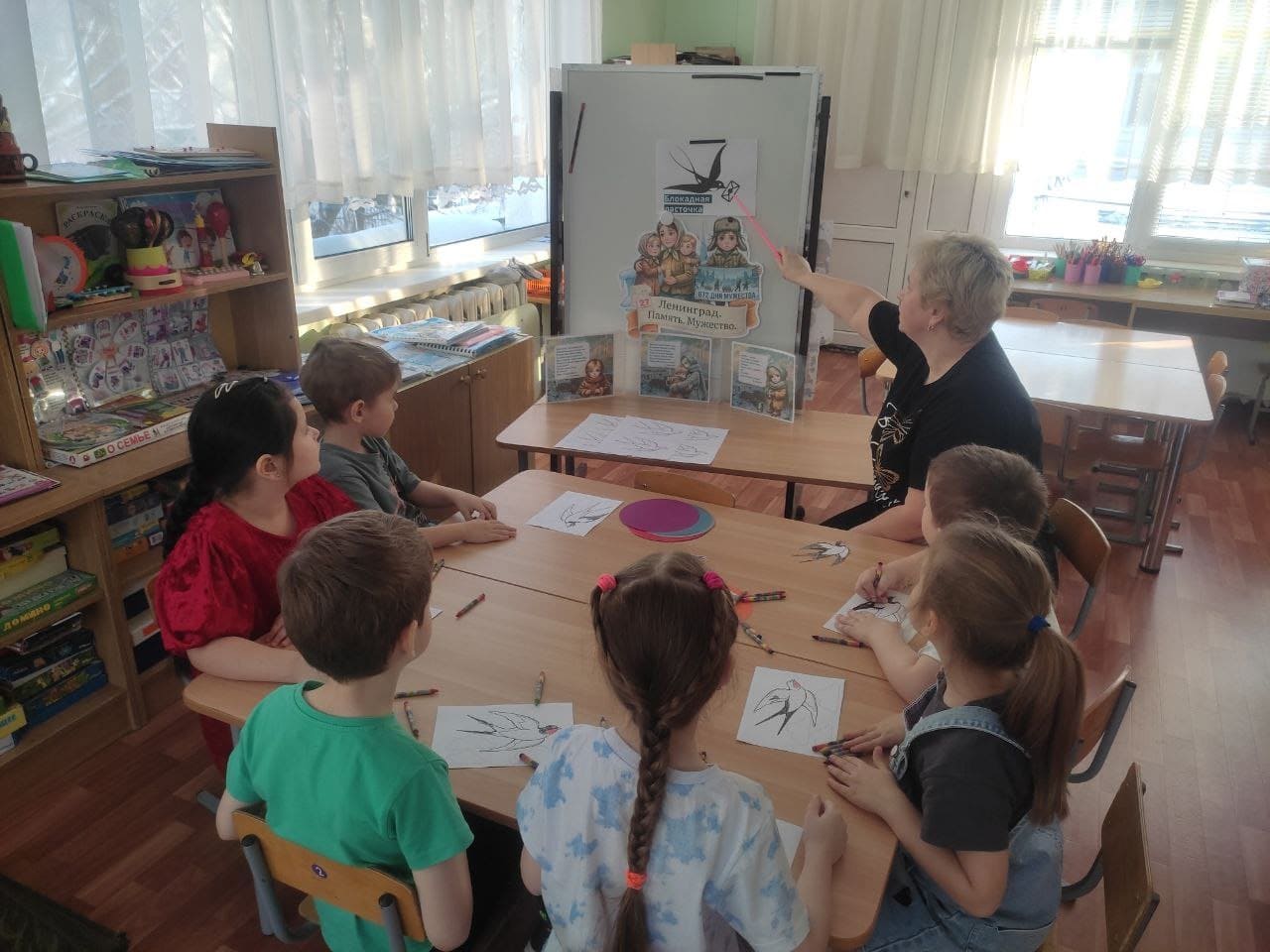 В старшей группе посмотрели презентацию «Дети блокадного Ленинграда», рассматривали сюжетные картины, прочитали историю «Блокадная ласточка» (Т. Кирюшатова), сделали поделку «Блокадная ласточка надежды». Для родителей размещена наглядная информация.